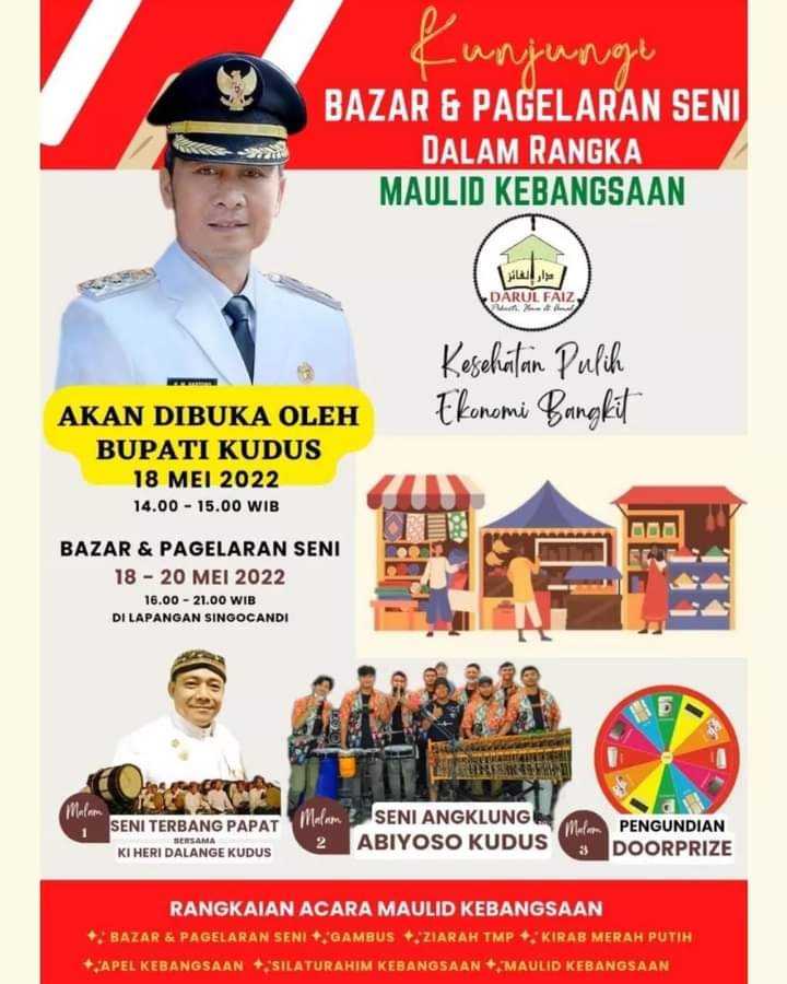 KUDUS, Suaranahdliyin.com – Darul Faiz, Singocandi, Kota, Kudus akan menyelenggarakan “Maulid Kebangsaan” di Lapangan Singocandi pada 18 – 20 Mei 2022 mendatang. Maulid Kebangsaan ini rencananya akan dibuka oleh Bupati Kudus, H Hartopo pada 18 Mei pukul 14.00 – 15.00 WIB.