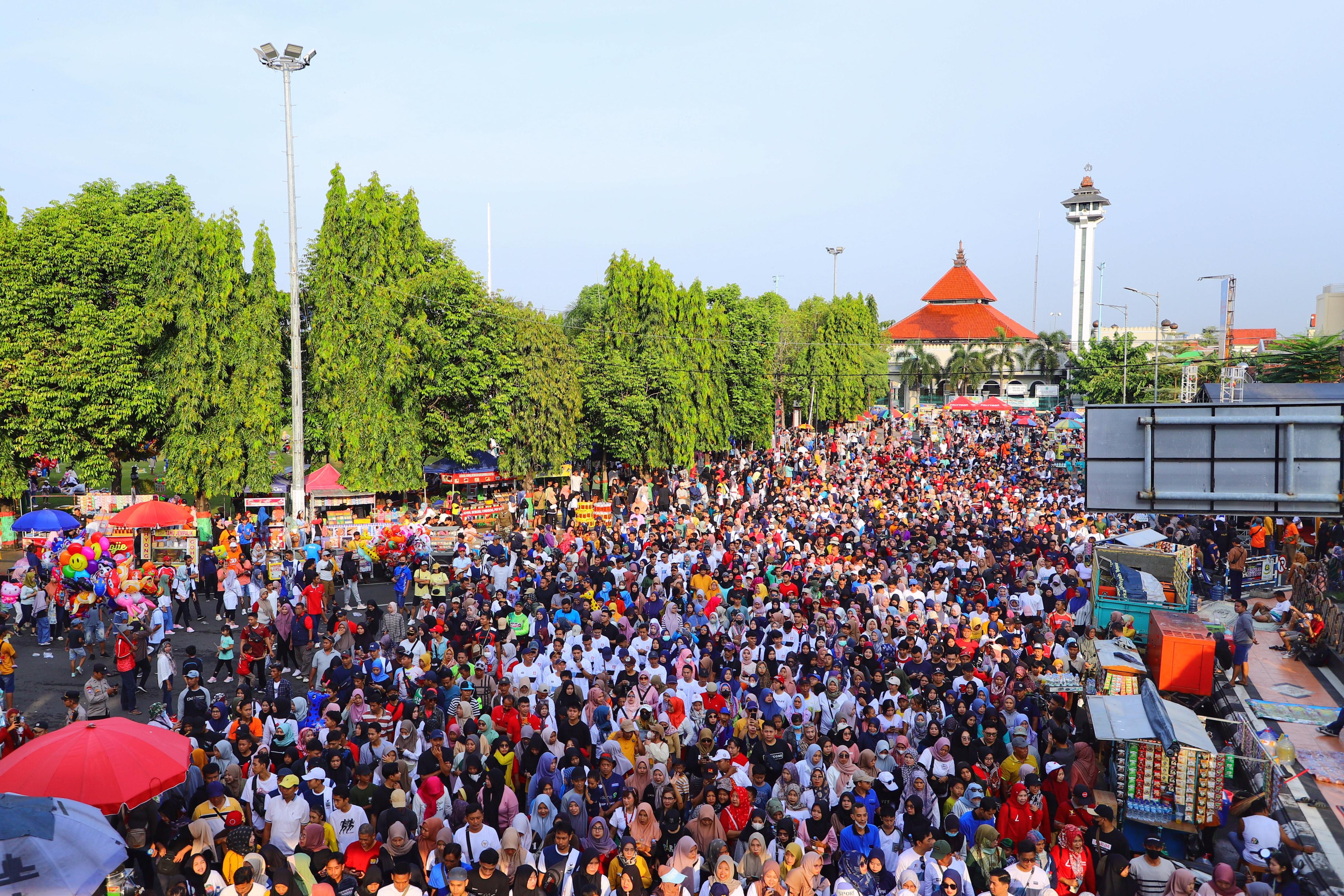 Puluhan ribu pekerja dari berbagai perusahan, berdatangan ke Alun-Alun Simpang Tujuh Kudus, untuk meramaikan agenda Jalan Santai dalam rangka Hari Buruh Internasional.