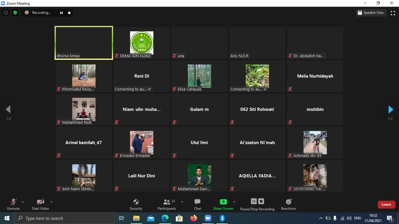 KUDUS, Suaranahdliyin.com – Pada Ramadan kali ini, Dewan Mahasiswa (Dema) IAIN Kudus menyelenggarakan kajian secara daring dengan mengusung tema “Taburan Ruhani Di Bulan Ramadhan” dengan mendaulat Dr Abdulloh Hamid MPd (RMI PBNU/ founder Dunia Santri Community) sebagai narasumber. Tema ini terinspirasi dari banyaknya kemuliaan yang Allah turunkan di bulan suci ini.
