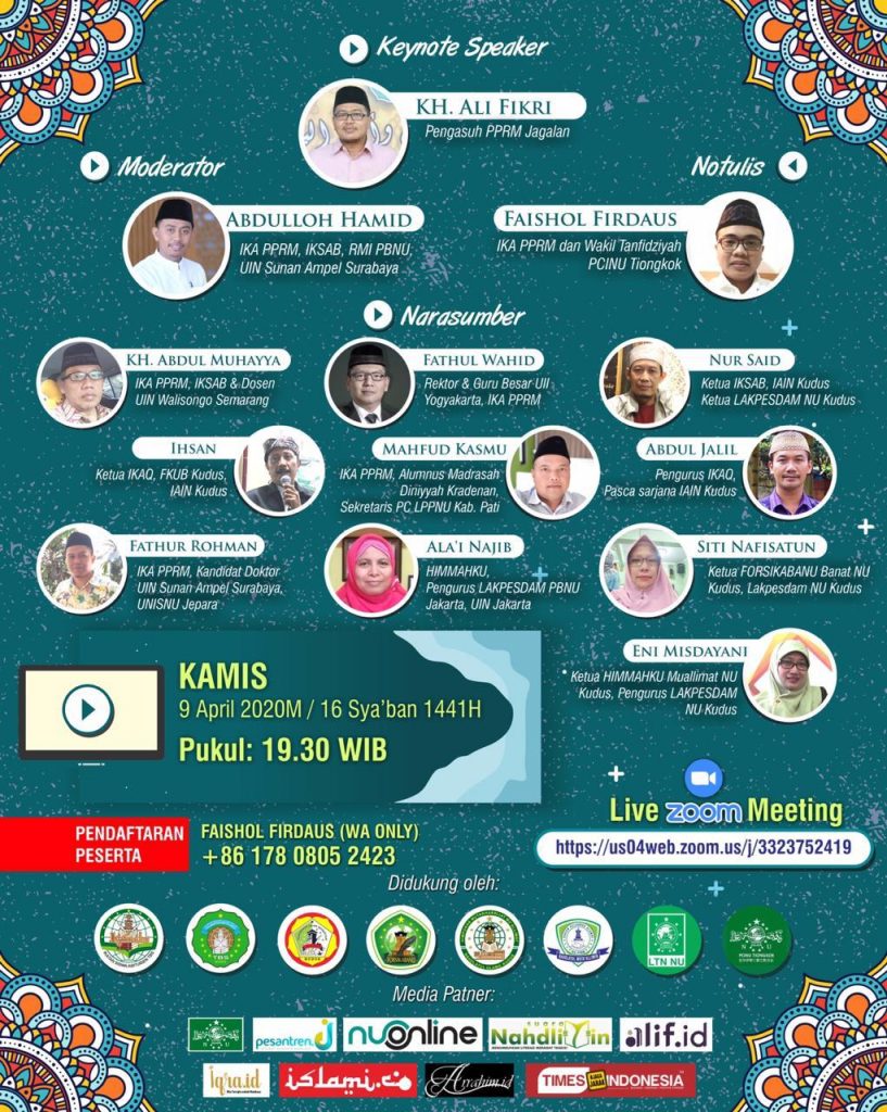 ‘’Penyelenggaraan Webinar ini antara lain didukung oleh keluarga Ndalem PPRM dan sejumlah alumni PPRM, Ikatan Alumni Qudsiyyah (IKAQ), Himpunan Mutakharrijat Mu’allimat Kudus (HIMMAHKU), Alumni Madrasah Diniyyah Kudus, LTNNU dan Forum Silaturahmi Alumni Banat NU Kudus (FORSIKABANU), dan PCINU Tiongkok,’’ katanya.