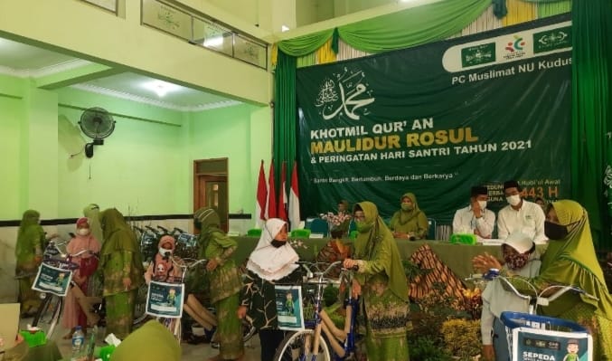 Penyerahan sepeda untuk anak yatim itu dilakukan di sela-sela gelaran khotmil quran, maulidurrasul dan peringatan Hari Santri Nasional (HSN) 2021 di Aula Gedung Serbaguna Darul Hadlonah Kudus.