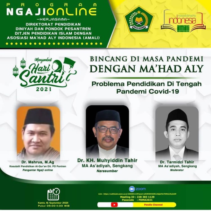 Ngaji online bertajuk “Problema Pendidikan di Tengah Pandemi Covid – 19” ini, akan dilangsungkan pada Kamis (16/9/2021) besok pukul 09.00 – 11.00 WIB melalui aplikasi zoom meeting.