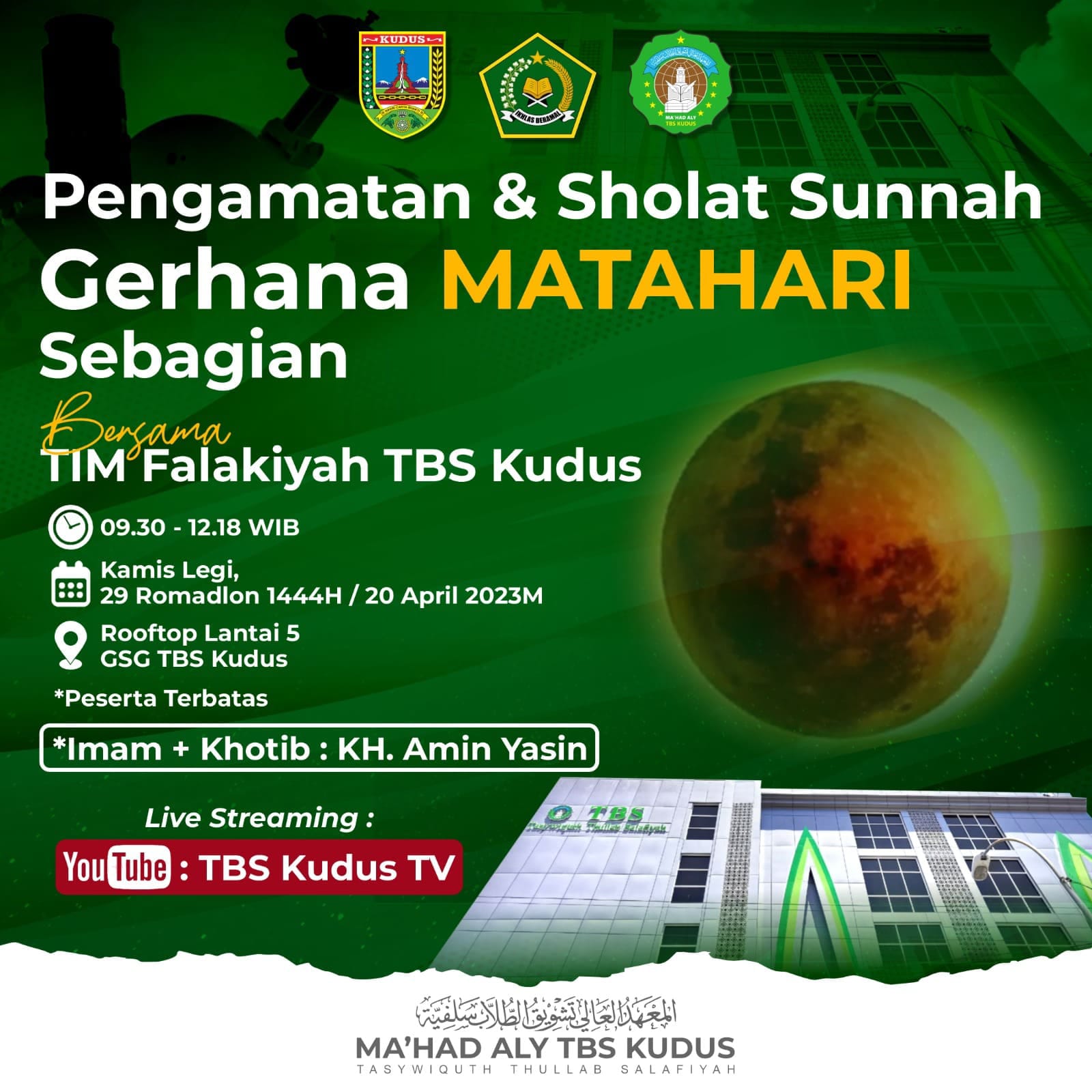 Untuk observasi (pengamatan) gerhana matahari, akan diisi pula dengan salat gerhana. Didaulat sebagai imam/ khatib pada kesempatan itu adalah KH Amin Yasin (Katib Syuriyah PCNU Kabupaten Kudus). (ros, mail/ rid, adb, gie)