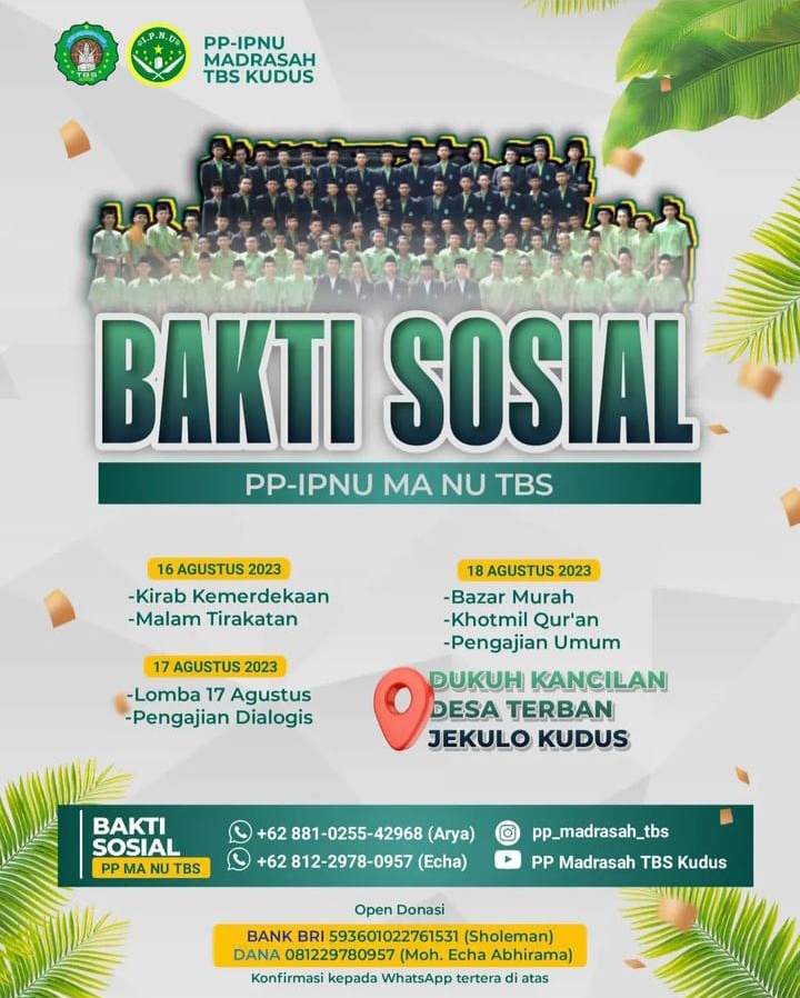 KUDUS, Suaranahdliyin.com – Persatuan Pelajar (PP)/ Organisasi Siswa Intra Sekolah (OSIS) MA NU Tasywiquth Thullab Salafiyah (TBS) Kudus akan menggelar Bakti Sosial (Baksos) di Dukuh Kancilan, Desa Terban, Kecamatan Jekulo.