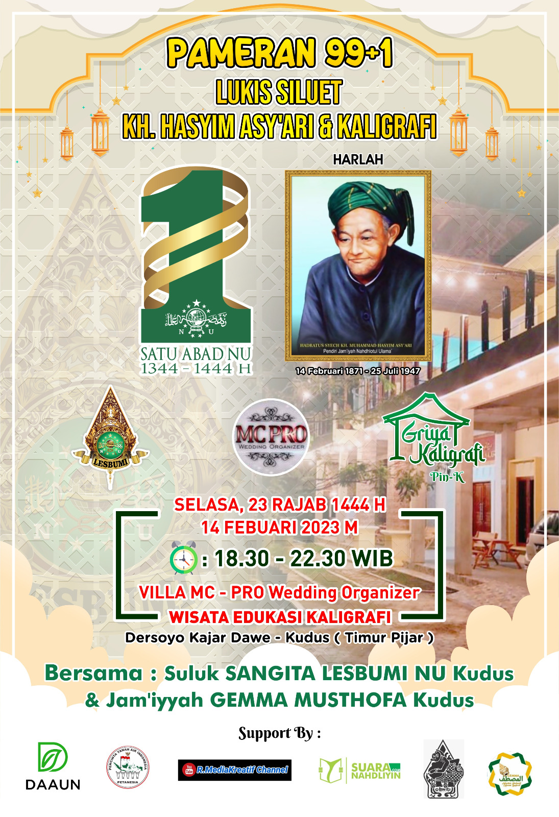 KUDUS, Suaranahdliyin.com – Bertempat di Villa MC – Pro Wedding Organizer & Wisata Edukasi Kaligrafi, akan digelar pameran kaligrafi dan 99+1 lukisan siluet KH M Hasyim Asy’ari (Mbah Hasyim).