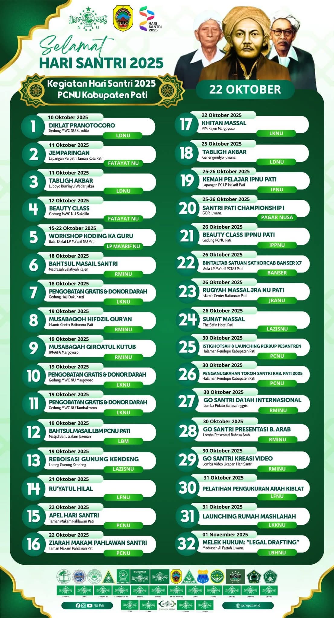 Kemudian, Pengobatan Gratis dan Donor Darah (19/10/2025), Bahtsul Masail LBM NU Pati (19/10/2025), Reboisasi Gunung Kendeng (19/10/2025), Ru’yatul Hilal (21/10/2025), Apel HSN (22/10/2025), Ziarah Makam Pahlawan Santri (22/10/2025), Khitan Massal (22/10/2025), Tabligh Akbar Juwana (25/10/2025), Kemah Pelajar IPNU Pati (25-26/10/2025), Santri Pati Championship I (35-26/10/2025), Beauty Class IPPNU Pati (26/10/2025), Bintaltab Satkorcab Banser Pati (26/10/2025).