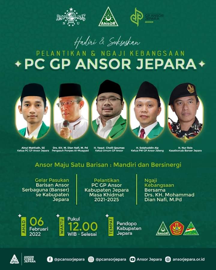 JEPARA, Suaranahdliyin.com – Pada Ahad (6/2/2022) mendatang, akan digelar pelantikan pengurus PC GP Ansor Kabupaten Jepara periode 2021 – 2025 yang dirangkai dengan ngaji kebangsaan, dengan mengusung tema “Ansor Maju Satu Barisan: Mandiri dan Bersinergi”.