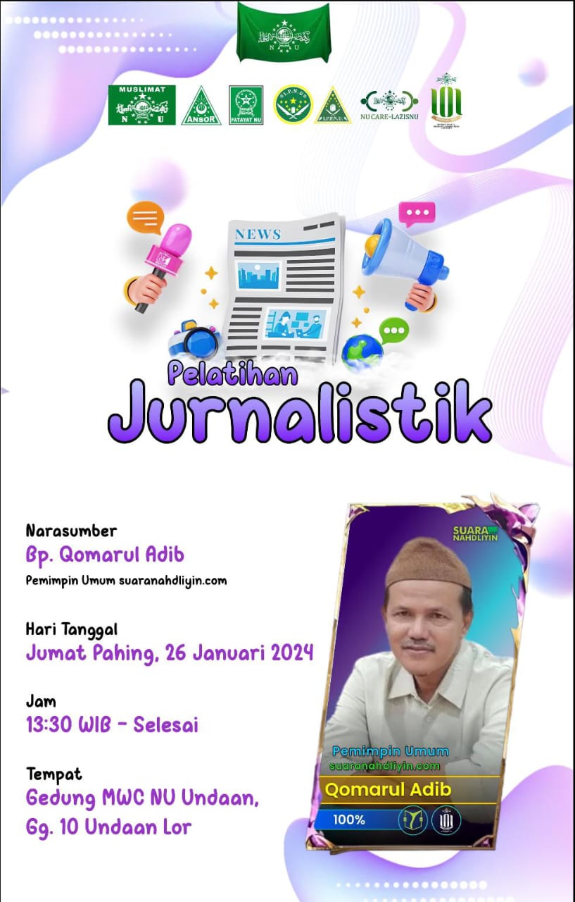KUDUS, Suaranahdliyin.com – Pada Jumat (26/1/2024) siang ini, mulai sekira pukul 13.30 WIB, akan dilangsungkan pelatihan jurnalistik bagi para kader Nahdlatul Ulama (NU) di wilayah Kecamatan Undaan dansekitarnya.