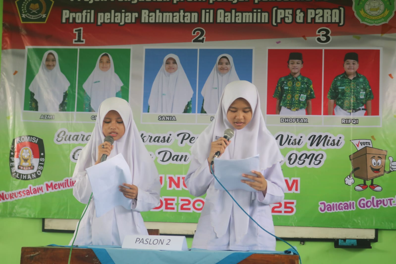 “Ada tiga paslon ketua dan wakil Ketua OSIS yakni Azmi Aprilya Habibi dan Gholya Jannatul Ulya (Paslon 1), Nimatus Sania dan Bassama Iffadatu Zahida (paslon 2), Ahmad Dhofar Hisan dan Muhammad Rifqi Faizal (paslon 3).”tutur Kepala MTsNU Nurussalam Julal Umam.