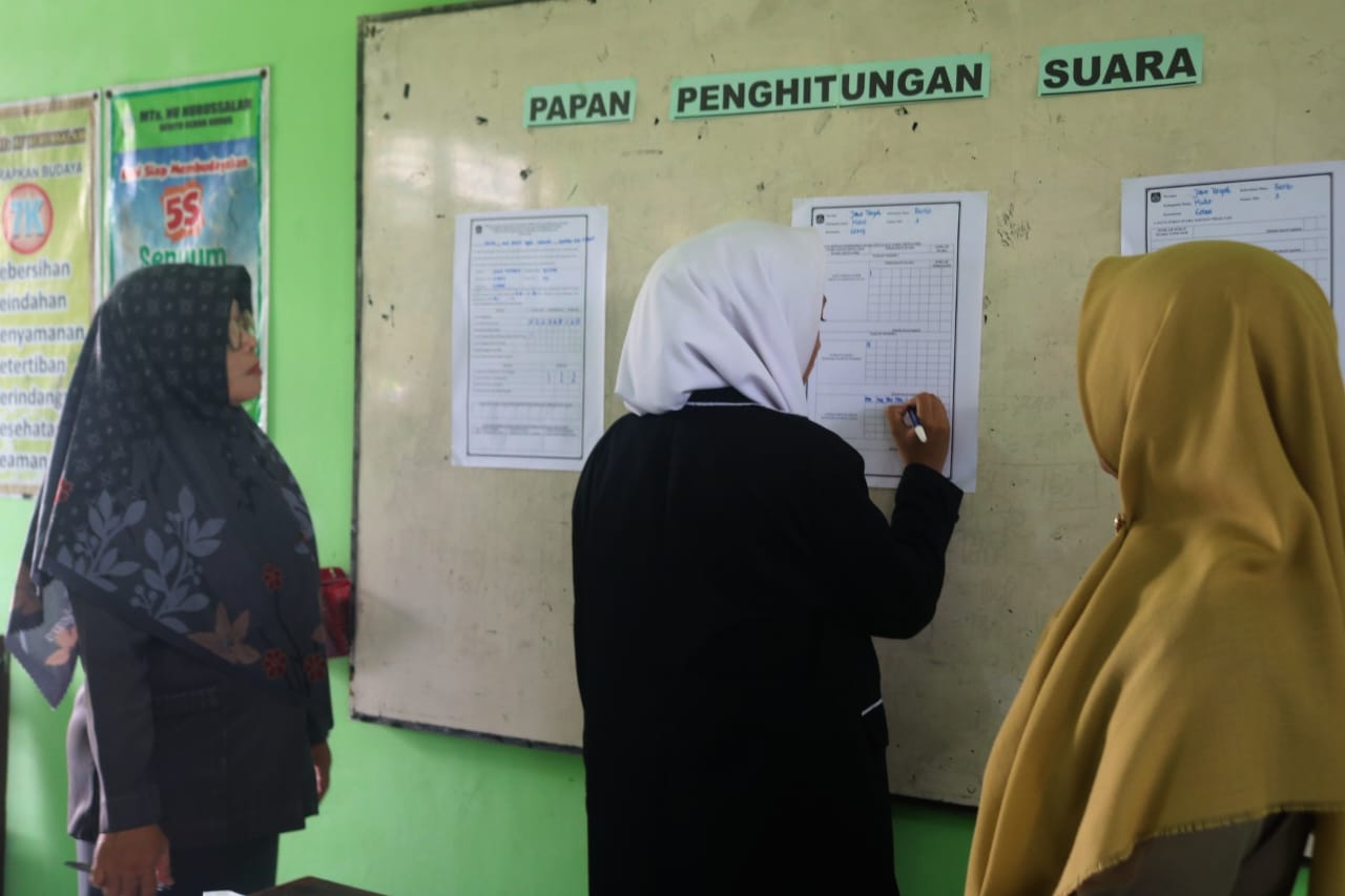 KUDUS, Suaranahdliyin.com – Meski pesta demokrasi sudah berakhir, namun nuansa pilihan presiden (pilpres) masih terasa di MTs NU Nurussalam Besito Gebog Kudus. Pasalnya, pemilihan Ketua -wakil Ketua OSIS madrasah bertajuk Suara Demokrasi dikemas seperti layaknya pemilu Pilpres.
