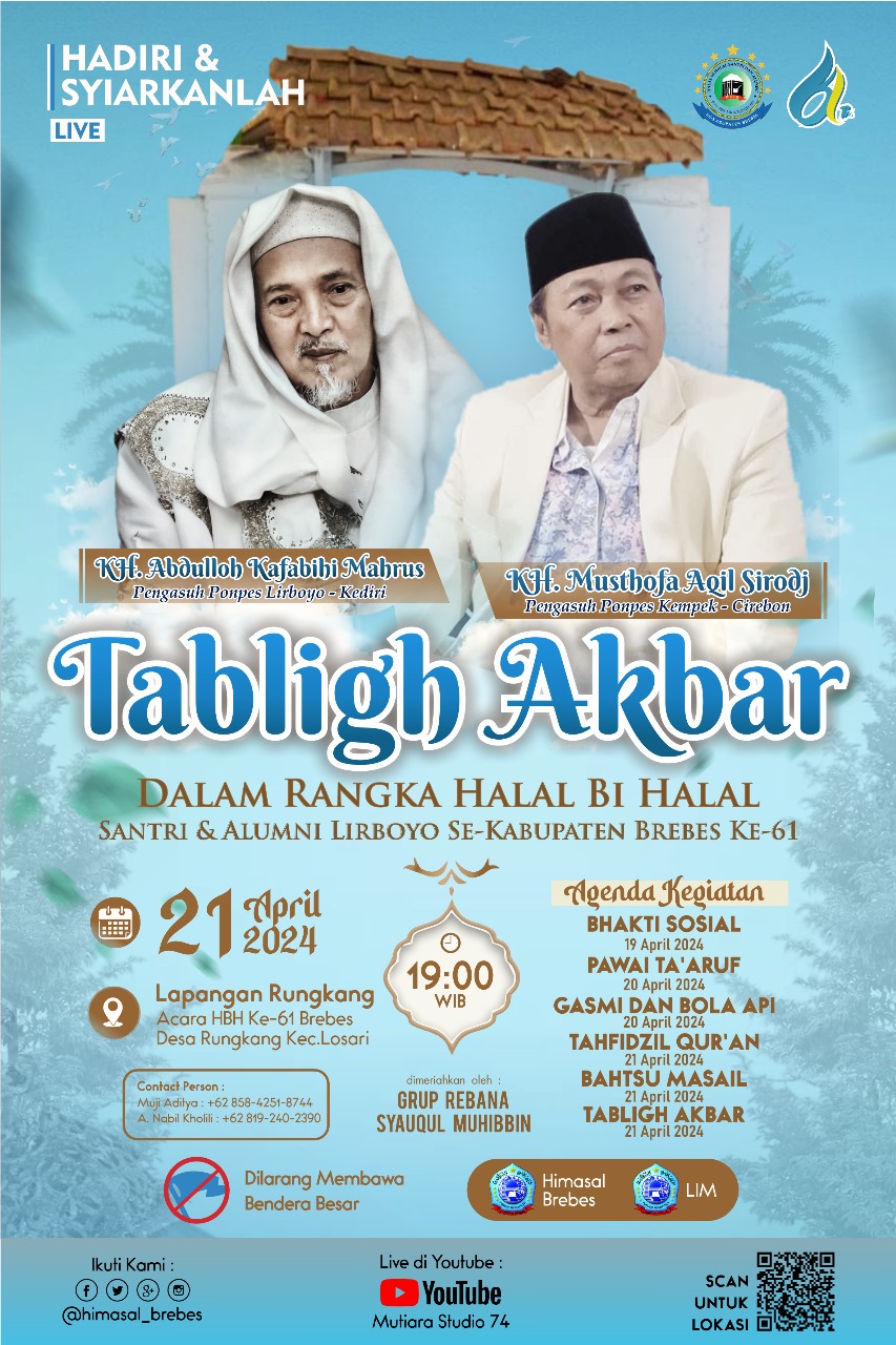 BREBES, Suaranahdliyin.com – Pengasuh Pondok Pesantren Lirboyo Kediri, KH Abdulloh Kafabihi Mahrus akan menyambangi santri dan alumninya pada acara Halal bi Halal dan Tabligh Akbar di lapangan desa Rungkang Kec Losari Brebes Ahad malam (21/4/2024).Brebes. Para alumni mempersiapkan penjemputan pada Ahad sore di Arjawinangun.