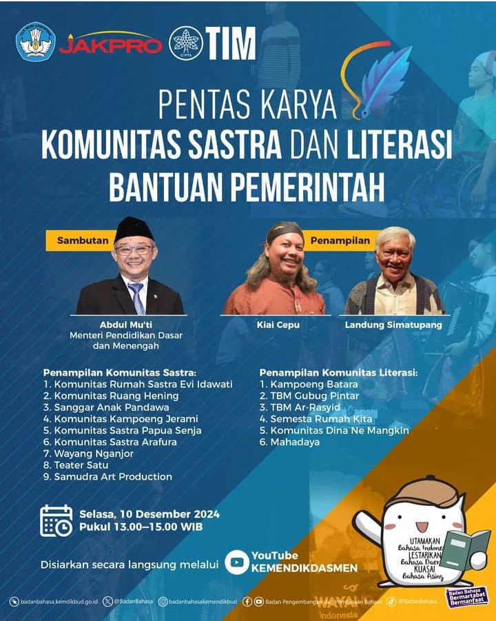 Untuk informasi, penampilan karya ini disiarkan langsung di kanal youtube Kemendikdasmen pada Selasa (10/2/2024) siang ini pada pukul 13.00 hingga 15.00 WIB.