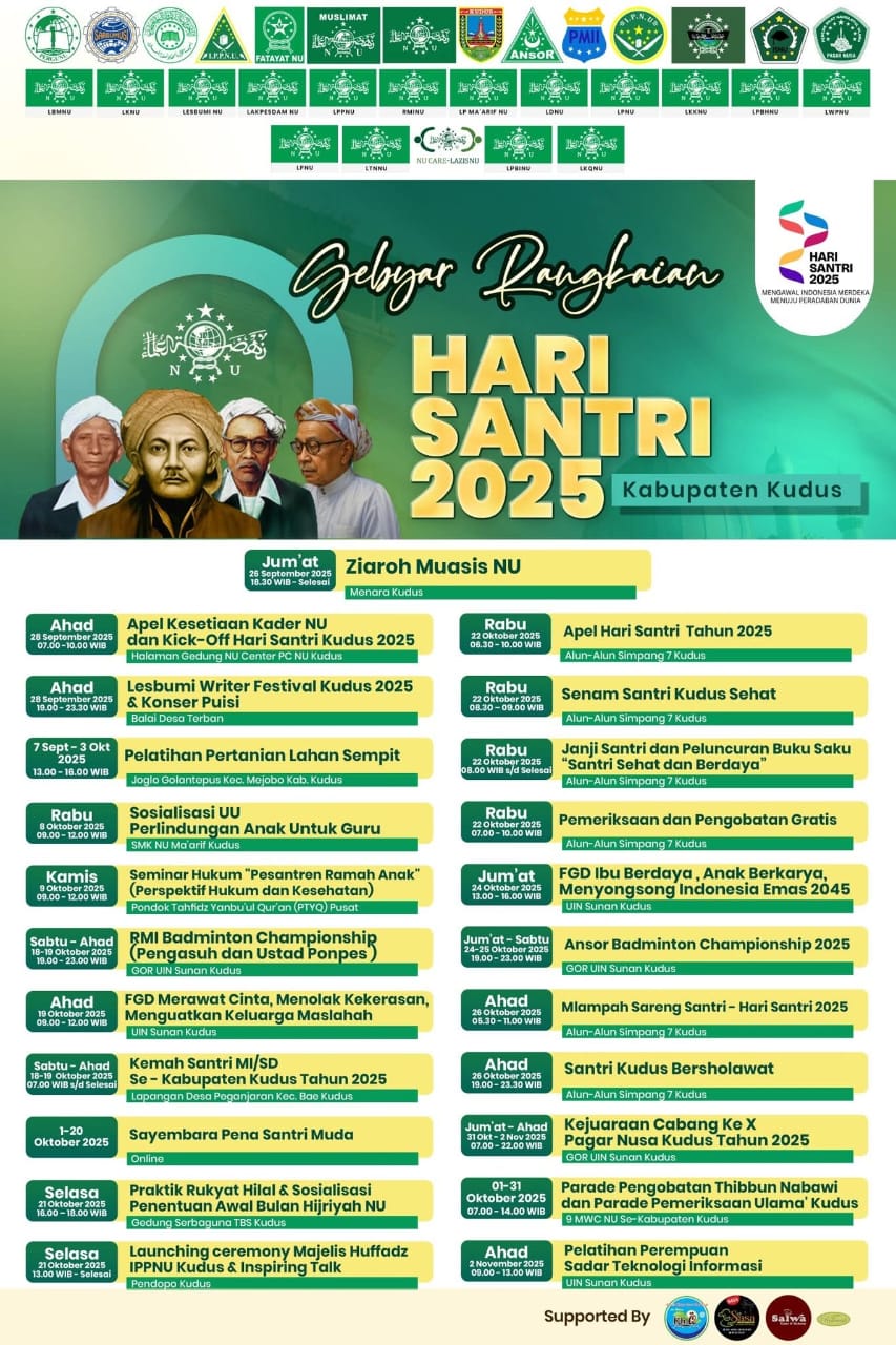 Lalu ada seminar “Pesantren Ramah Anak” pada 9 Oktober, FGD Merawat Cinta Menolak Kekerasan Menguatkan Keluarga Maslahah (19 Oktober), apel HSN pada 22 Oktober, serta senam santri Kudus sehat (22 Oktober).