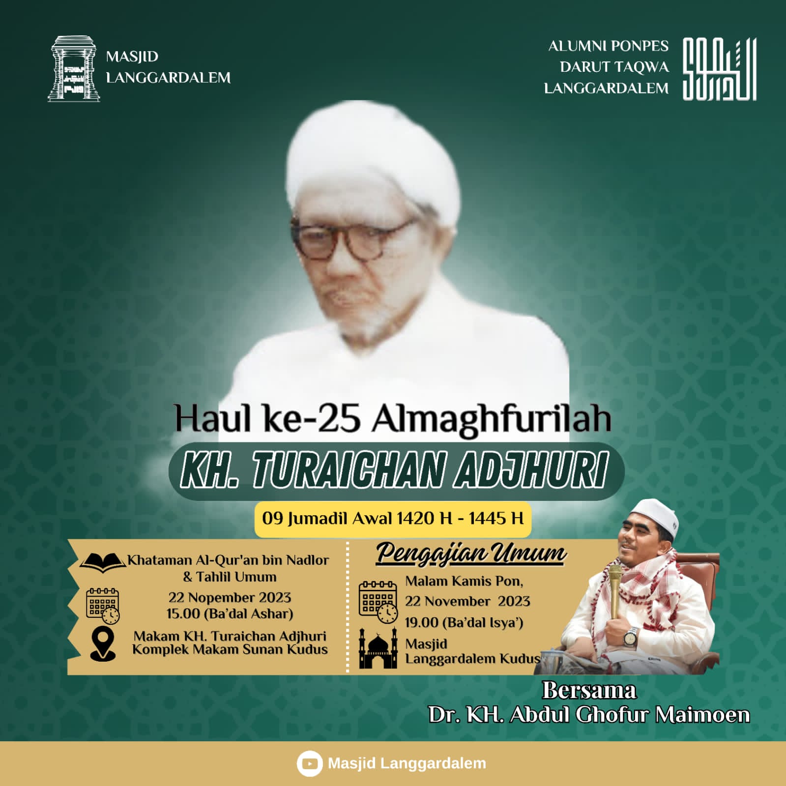 Peringatan haul akan dilangsungkan 09 Jumadil Awal 1445 H yang bertepatan dengan 22 November 2023 M. Dengan agenda, khataman al-Quran bin nadlor dan tahlim umum di maqbarah Mbah Tur (kompleks makam Sunan Kudus) bakdal Ashar dan pengajian umum dilangsungkan bakdal Isyak. (rls/ ros, gie)
