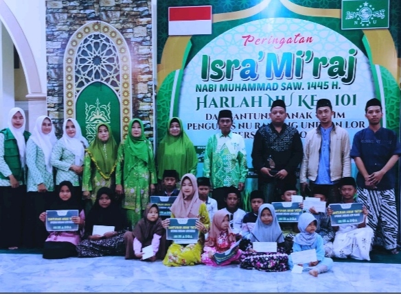 KUDUS,Suaranahdliyin.com – Pengurus Ranting Nahdlatul Ulama (PRNU) bersama badan otonom desa Undaan Lor mengadakan peringatan Isra Mi’raj Nabi Muhammad SAW sekaligus hari lahir (harlah) ke-101 NU di Masjid Baitussalam Gang 3 desa setempat Jum’at (16/2/2024) malam. Dalam acara itu, PRNU Undaan Lor membagikan santunan anak yatim.