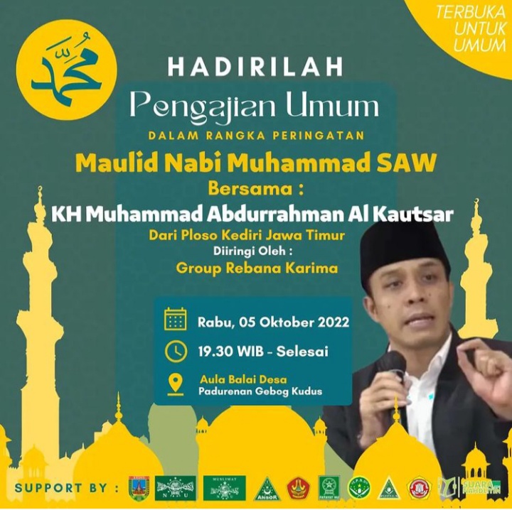 KUDUS, Suaranahdliyin.com – Bertempat di Aula Balai Desa Padurenan, Kecamatan Gebog, Kabupaten Kudus akan digelar peringatan Maulid Nabi Muhammad Shallallahu alaihi wasallam, Rabu (5/10/2022) mulai pukul 19.30 WIB.