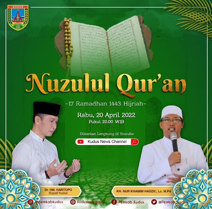 KUDUS, Suaranahdliyin.com – Bertempat di pendapa Kabupaten Kudus pada Rabu (20/4/2022) malam nanti, akan dilangsungkan peringatan Nuzulul Quran tingkat Kabupaten Kudus pada 2022.