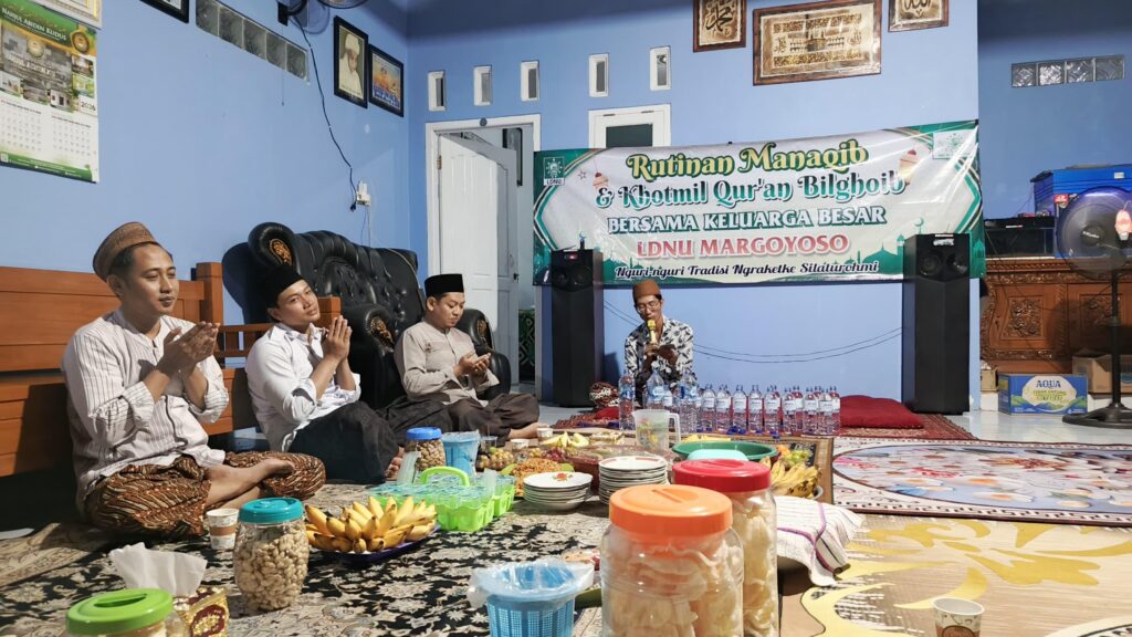 PATI,Suaranahdliyin.com, Lembaga Dakwah Nahdlatul Ulama (LDNU) MWC Margoyoso Pati rutin menggelar Manaqib Syaikhona Abdul Qadir Al-Jailani dan Khotmil Qur’an Bil Ghoib setiap bulan sekali. Kegiatan ini bertujuan memperkuat robithoh bathiniyah, dhohiriyah, dan jam’iyah, sekaligus menumbuhkan kecintaan pada Al-Qur’an serta amaliyah Ahlussunnah wal Jama’ah.