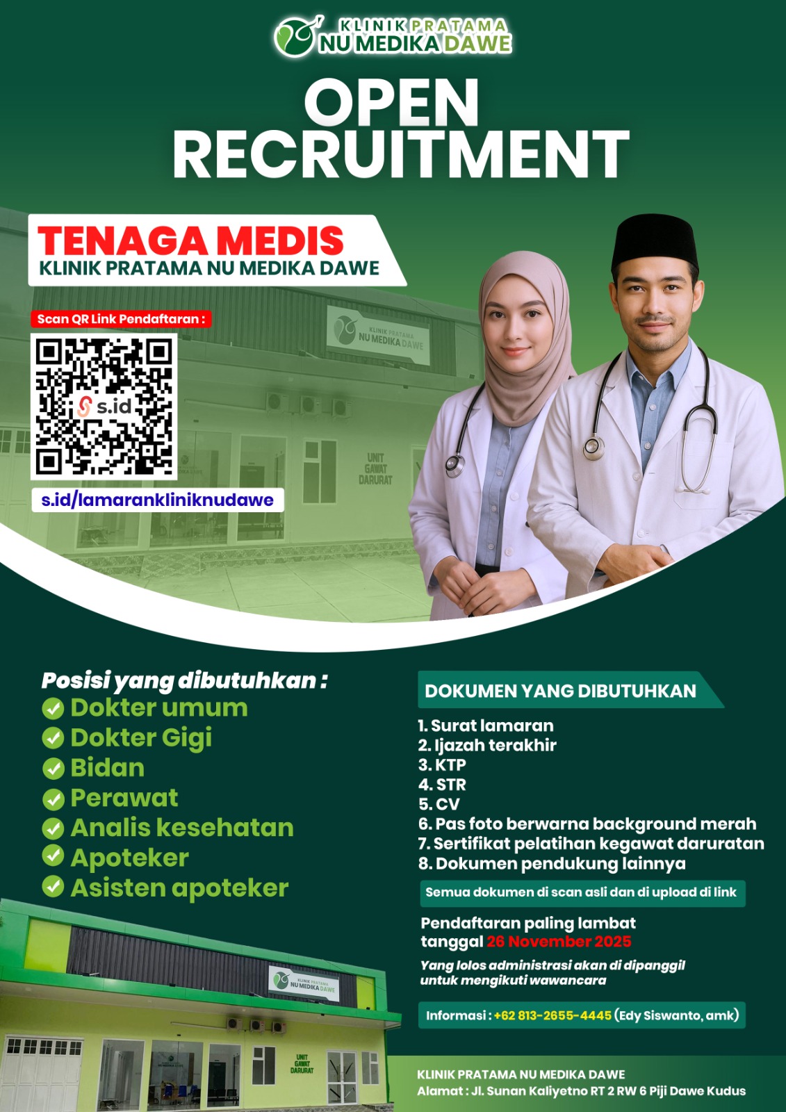 Dalam open rekrutmen ini, Klinik NU Medika Dawe membutuhkan dokter umum, dokter gigi, bidan, perawat, analis kesehatan, apoteker dan asisten apoteker. Pendaftaran paling lambat 25 November 2025. (Yuliana/adb)