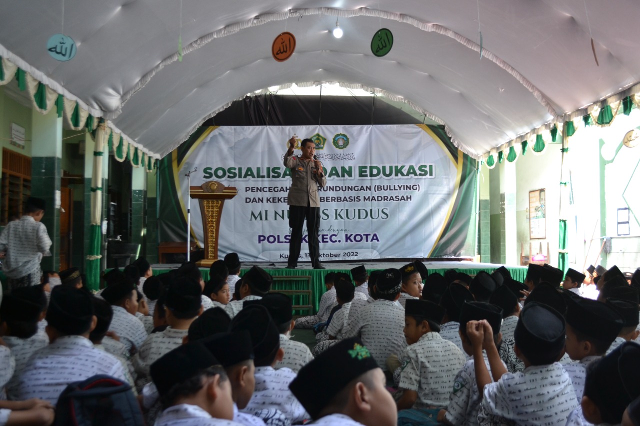 KUDUS, Suaranahdliyin.com – Polsek Kecamatan Kota, Kabupaten Kudus melakukan sosialisasi bahaya bullying kepada ratusan peserta didik di MI NU Tasywiquth Thullab Salafiyah (TBS) Kudus, Kamis (13/10/2022).