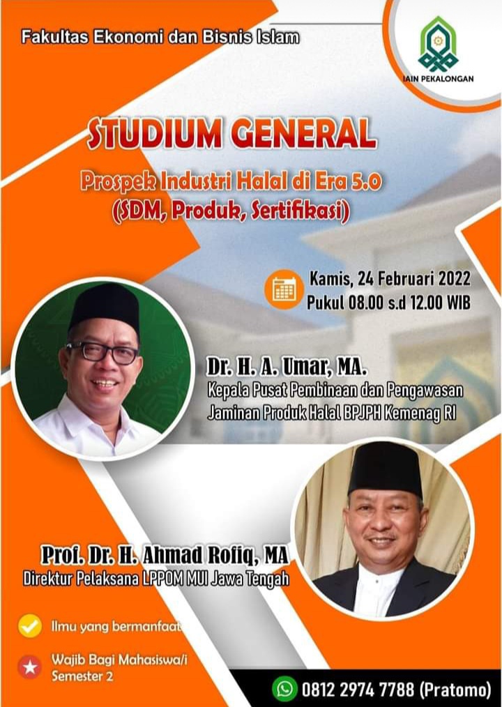 PEKALONGAN, Suaranahdliyin.com – IAIN Pekalongan akan menyelenggarakan Studium General dengan mengusung tema “Prospek Industri Halal di Era 5.0: SDM, Produk dan Sertifikasi”.