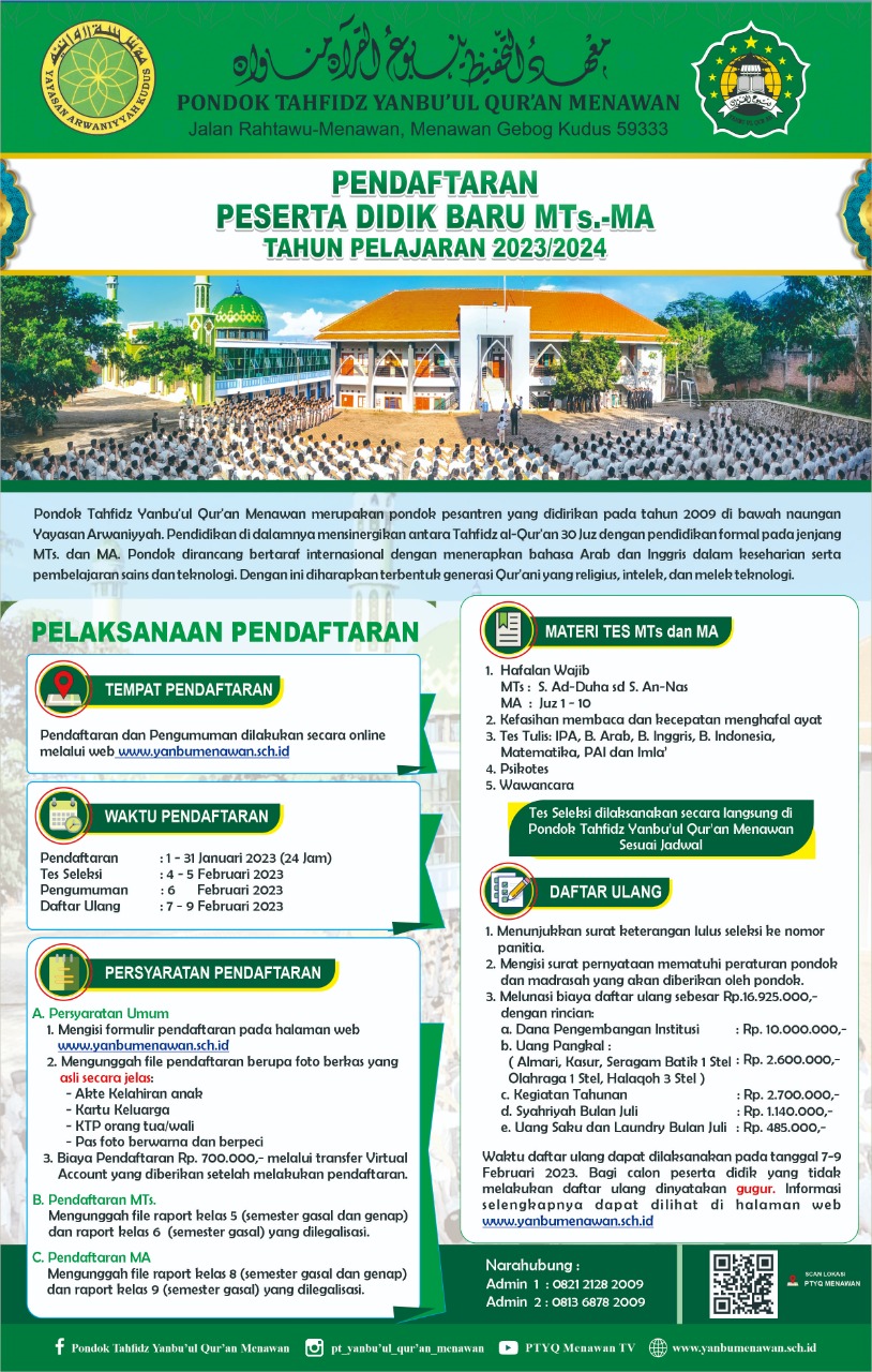 KUDUS, Suaranahdliyin.com – Pondok Tahfidh Yanbu’ul Qur’an Menawan (PTYQM), dalam waktu dekat kembali akan membuka pendaftaran peserta didik baru jenjang Madrasah Tsanawiyah (MTs) dan Madrasah Aliyah (MA) tahun pelajaran 2023/ 2024 M.