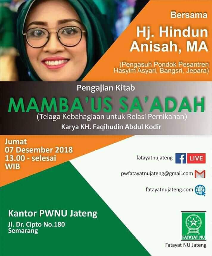 Kajian kitab karya KH. Faqihudin Abdul Qodir yang menghadirkan Nyai Hj. Hindun Anisa (pengasuh Pondok Pesantren Hasyim Asy’ari Bangsri, Jepara) sebagai narasumber, ini dilangsungkan di Kantor PWNU Jateng Hl. Dr. Cipto No. 180 Semarang, Jum’at (7/12/2018) mulai pukul 13.00 WIB. (ros, adb, gie)