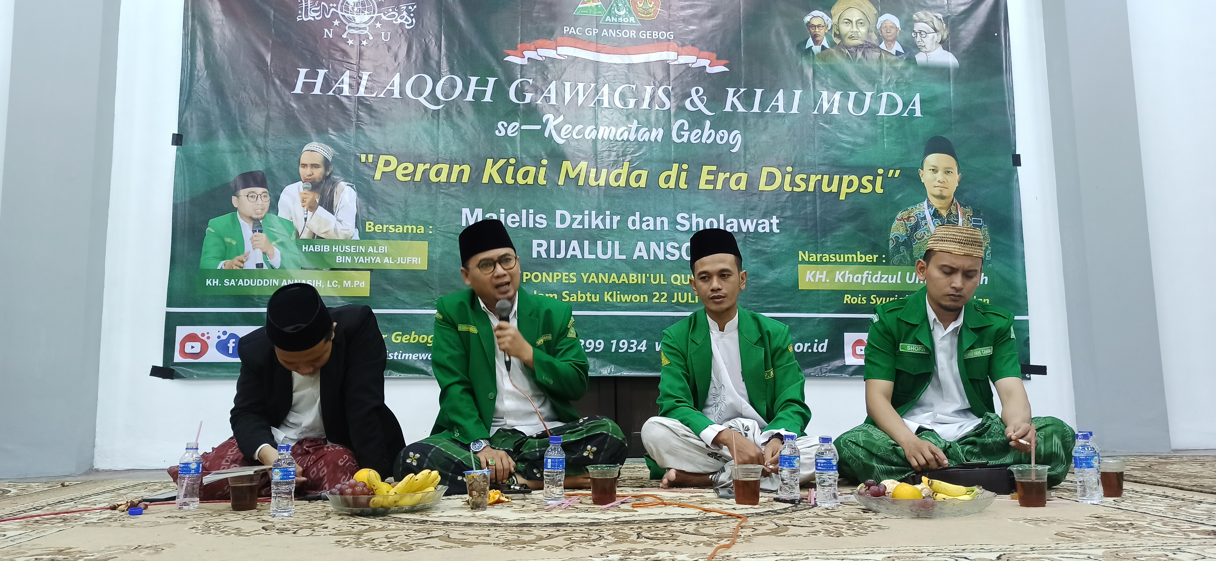 KUDUS,Suaranahdliyin.com – Majelis Dzikir dan Sholawat Rijalul Ansor Kecamatan Gebog Kudus mengadakan halaqoh gawagis (sebutan para gus) dan kiai muda di Pesantren Yanaabi’ul Qur’an Karangmalang,Jum’at (22/7/2022). Halaqoh bertema peran kiai muda di era disrupsi ini menghadirkan Habib Husein AL-Jufri, KH. Khafidzul Umam (Rais PCINU Sudan) dan KH. Saadudin Nasih (ketua LDNU Kudus)