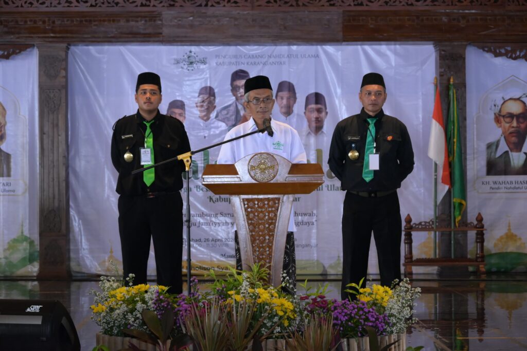 KH Abdul Aziz menyampaikan hal itu dalam Halalbihalal Keluarga Besar NU di Gedung Kebudayaan Kabupaten Karanganyar, Ahad (26/4/2026). Kegiatan dengan mengangkat tema “Menyambung Sanad, Memperkuat Ukhuwah, Menuju Jam’iyyah yang Mandiri dan Digdaya” sekaligus menjadi momentum penutup masa khidmat kepengurusan PCNU Karanganyar.