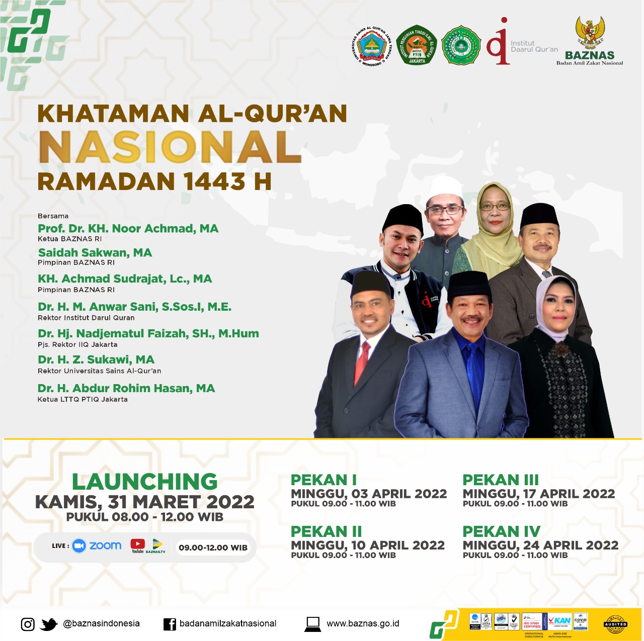 Selain ketua dan pimpinan Baznas RI, launching tersebut juga akan dihadiri oleh Dr KH M Anwar Sani SSosI ME (Rektor Institut Darul Quran), Dr Hj Nadjematul Faizah SH MHum (Rektor IIQ Jakarta), Dr H Z Sukawi MA (Rektor Unsiq) dan Dr H Abdur Rohim Hasan MA (Ketua LTTQ PTIQ Jakarta).