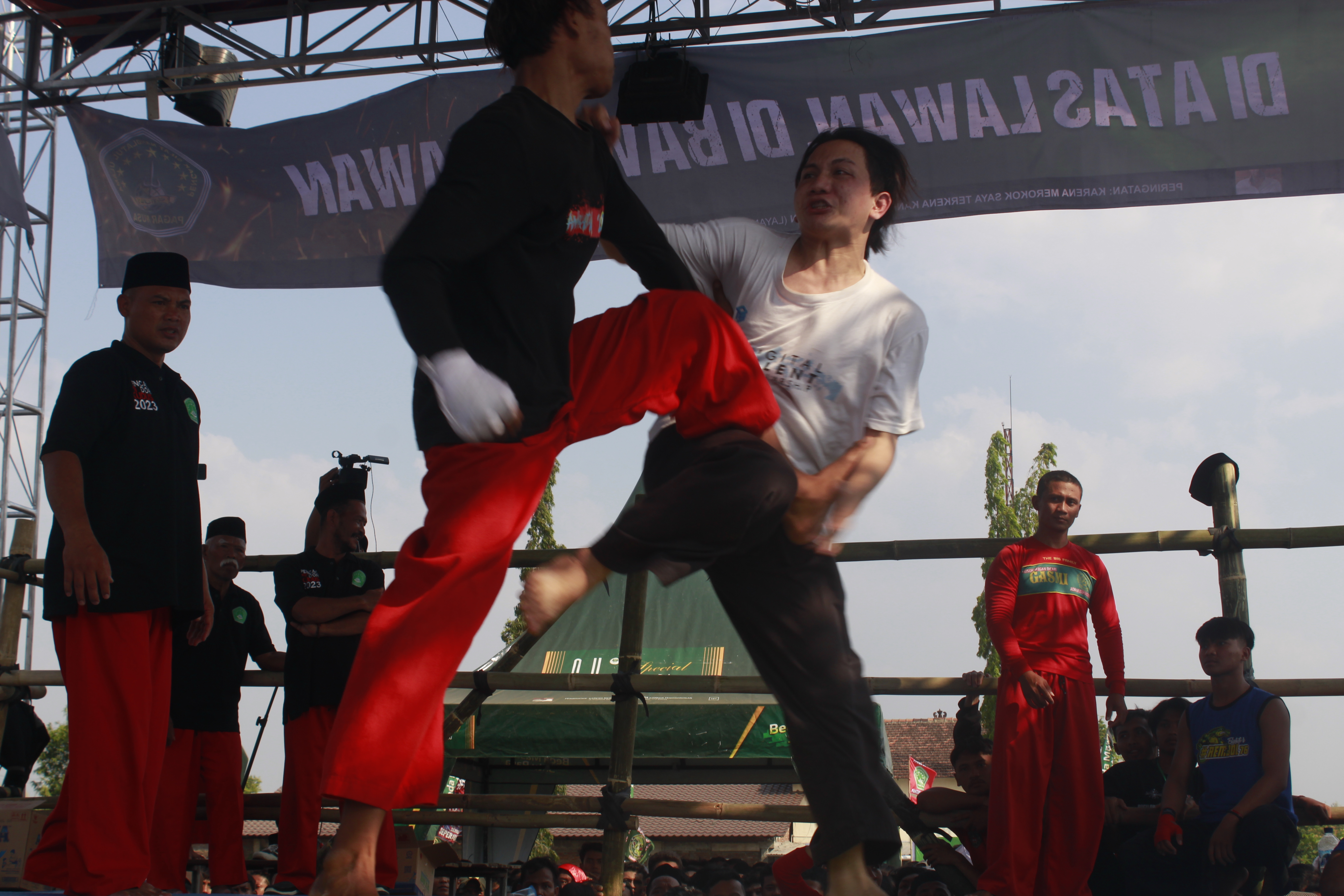 KUDUS,Suaranahdliyin.com – Perhelatan Pencak Dor di lapangan desa Tanjungrejo Jekulo Kudus Ahad (20/8/2023) menjadi daya tarik ratusan pesilat nusantara. Mereka yang datang dari berbagai daerah turut berlaga tarung bebas satu lawan satu di atas ring pertandingan.