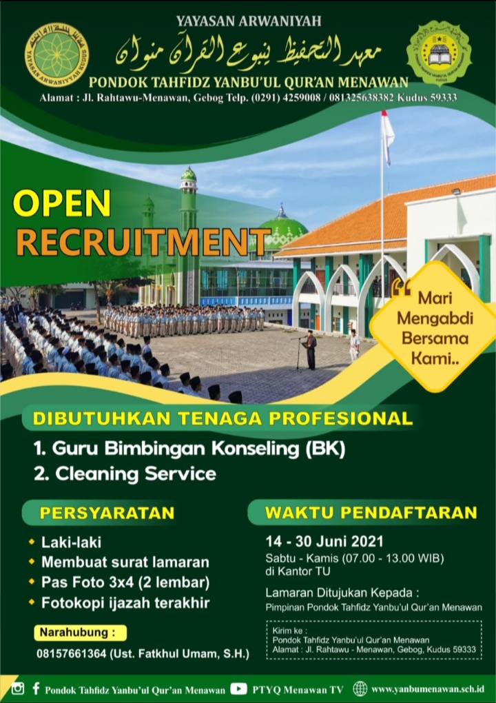 KUDUS, Suaranahdliyin.com – Pondok Tahdih Yanbu’ul Qur’an Menawan (PTYQM) membuka rekrutmen tenaga untuk menempati posisi sebagai guru Bimbingan KOnseling (BK) dan cleaning service.