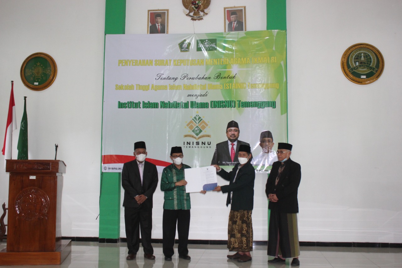 TEMANGGUNG, Suaranahdliyin.com – Sekolah Tinggi Agama Islam Nahdlatul Ulama (STAINU) Temanggung, resmi beralih bentuk menjadi Institut Islam Nahdlatul Ulama (INISNU) Temanggung. Hal itu ditandai dengan penyerahan Surat Keputusan Menteri Agama (KMA) Nomor 324 Tahun 2021 tentang Perubahan Bentuk STAINU Menjadi INISNU Temanggung, Selasa (15/6/2021).