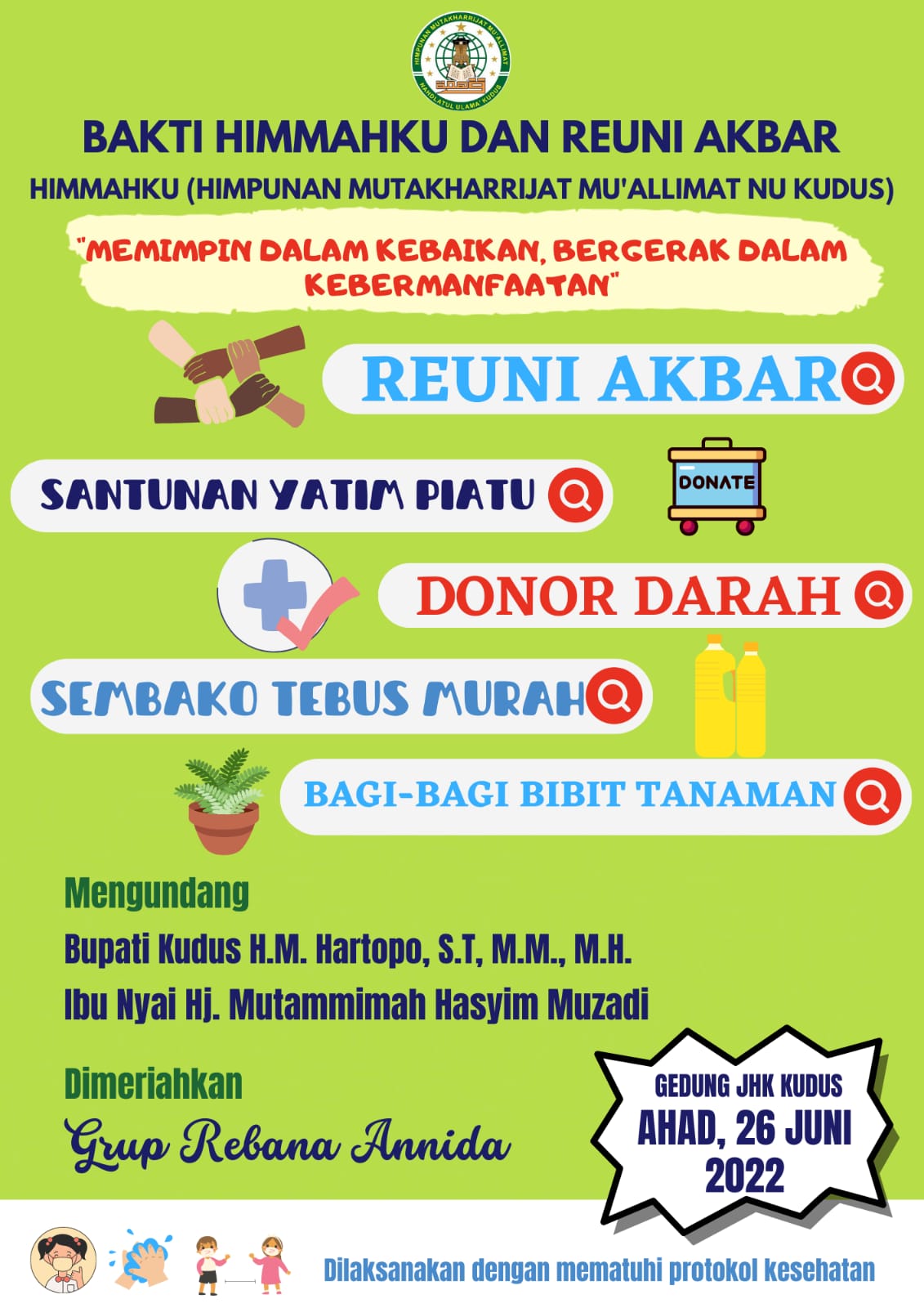 Reuni akbar akan dilangsungkan di Gedung Jam’iyyatul Hujjaj Kudus (JHK) pada Ahad (26/6/2022) dengan mengusung tema “Memimpin dalam Kebaikan, Bergerak dalam Kebermanfaatan”.