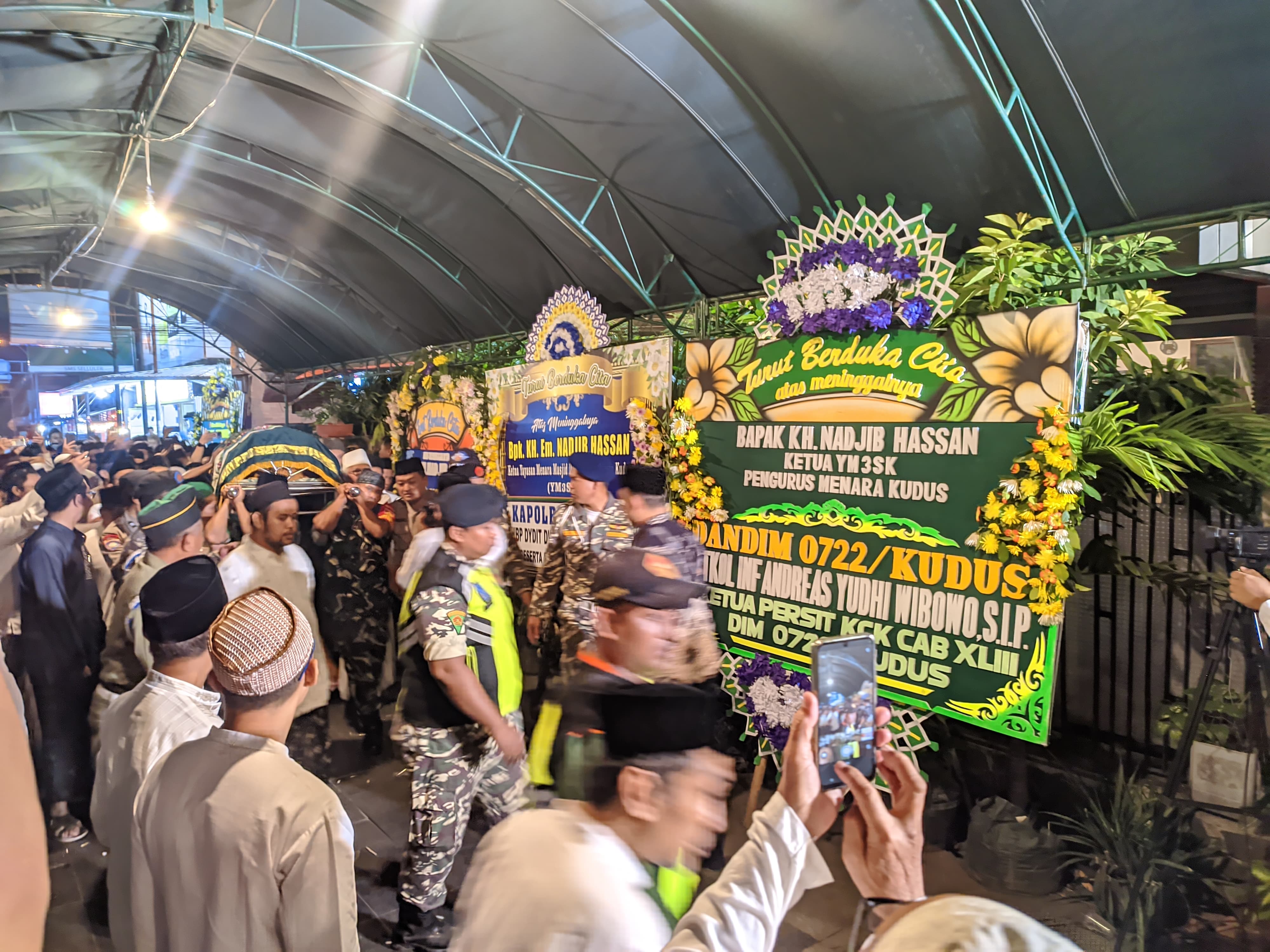 KUDUS,Suaranahdliyin.com – Ribuan pelayat memberikan penghormatan kepada almarhum Ketua Yayasan Masjid, Menara dan Makam Sunan Kudus (YM3SK) KH. Em. Nadjib Hassan, Jum’at (9/2/2024). Mereka menghantarkan jenazah A’wan PBNU dari rumah duka Jl Menara Kudus Jum’at (9/2/2023) pukul 20.00 Wib menuju peristirahatan terakhir di makam Sedio Luhur Bakalan Krpayak Kudus.