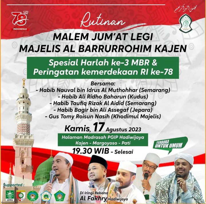 PATI, Suaranahdiyin.com – Rutinan malam Jum’at Legi Majelis Barrurrohim (MBR), akan menggelar majelis dzikir dan sholawat pada Kamis (17/8/2023) mendatang di halaman madrasah PGIP Hadiwijaya Kajen, Margoyoso, Pati.