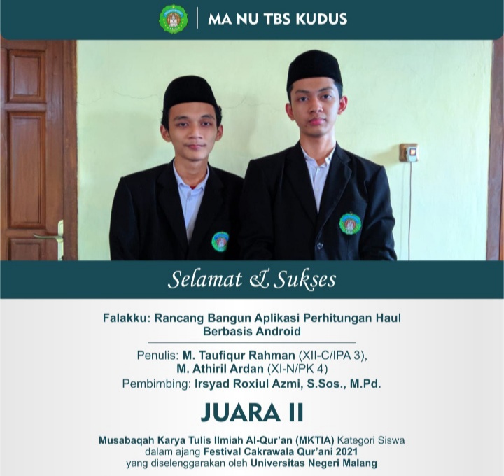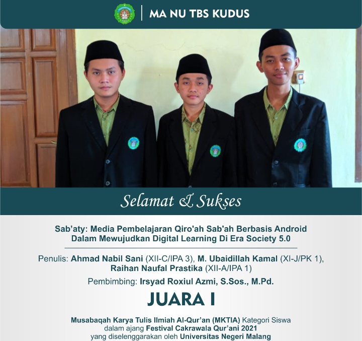 MALANG, Suaranahdliyin.com – Mantap. Dua tim dari MA NU Tasywiquth Thullab Salafiyah (TBS) Kudus, berhasil menyabet dua penghargaan sekaligus dalam Festival Cakrawala Qur’ani (FCQ) 2021 Nasional yang diselenggarakan oleh Universitas Negeri Malang (UM).