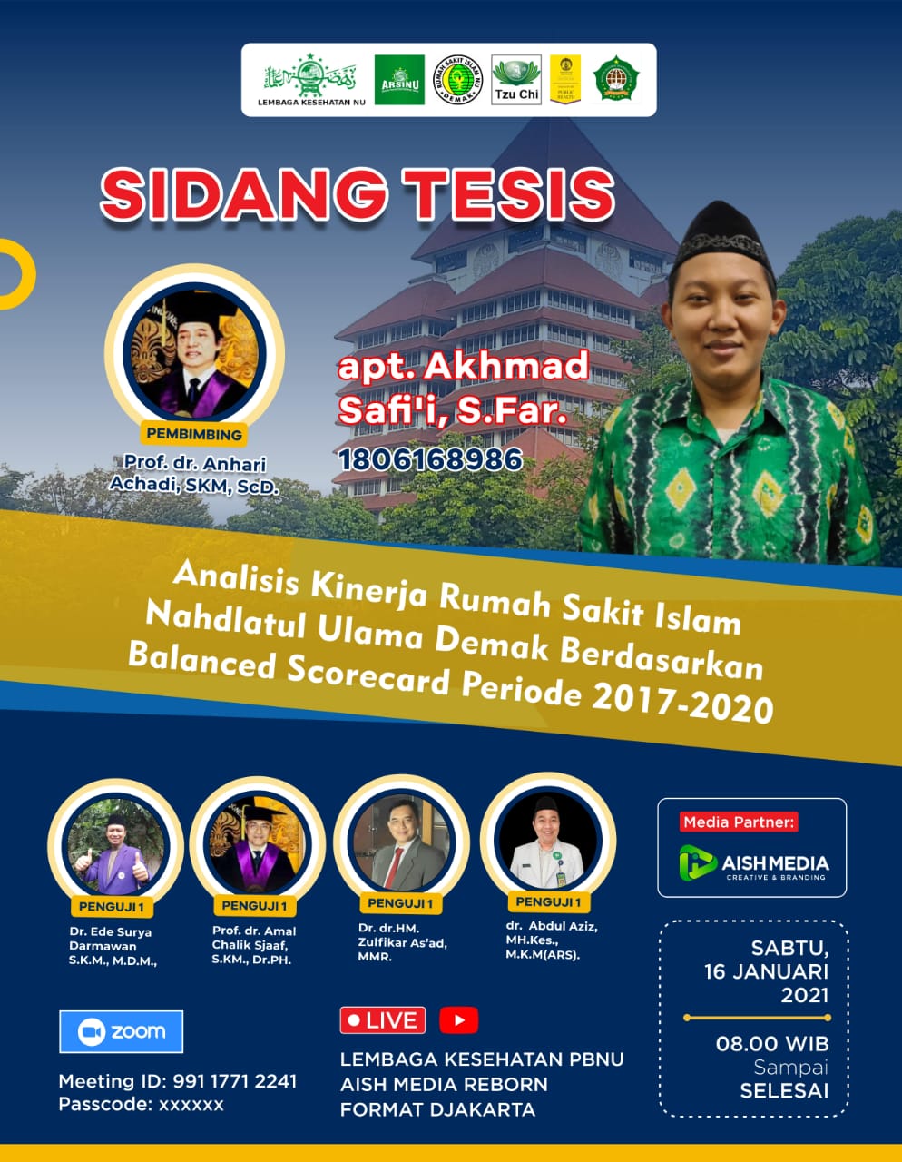 Kajian tesisnya yang diujikan melalui Zoom dan disiarkan langsung pula melalui akun youtube Lembaga Kesehatan PBNU, berjudul “Analisis Kinerja RSINU Demak Berdasarkan Balanced Scorecard Periode 2017 – 2020” dengan pembimbing Prof. dr. Anhari Achadi SKM. ScD.