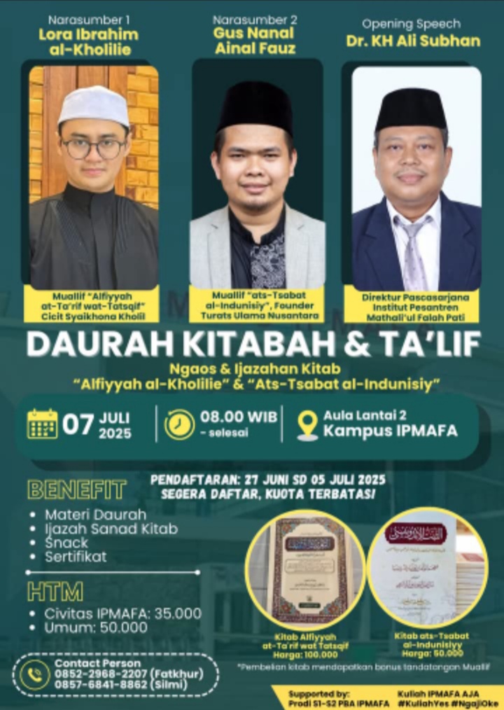 Daurah Kitabah dan Ta’lif: Ngaos dan Ijazahan Kitab Alfiyyah al-Kholilie (Kitab Alfiyyah tentang Kepenulisan) dan Kitab Ats-Tsabat al-Indunisiy (Mu’jam Muallafat Ulama Nusantara) in diagendakan dilangsungkan pada Senin Kliwon, 7 Juli 2025 M/ 11 Muharram 1447 H.