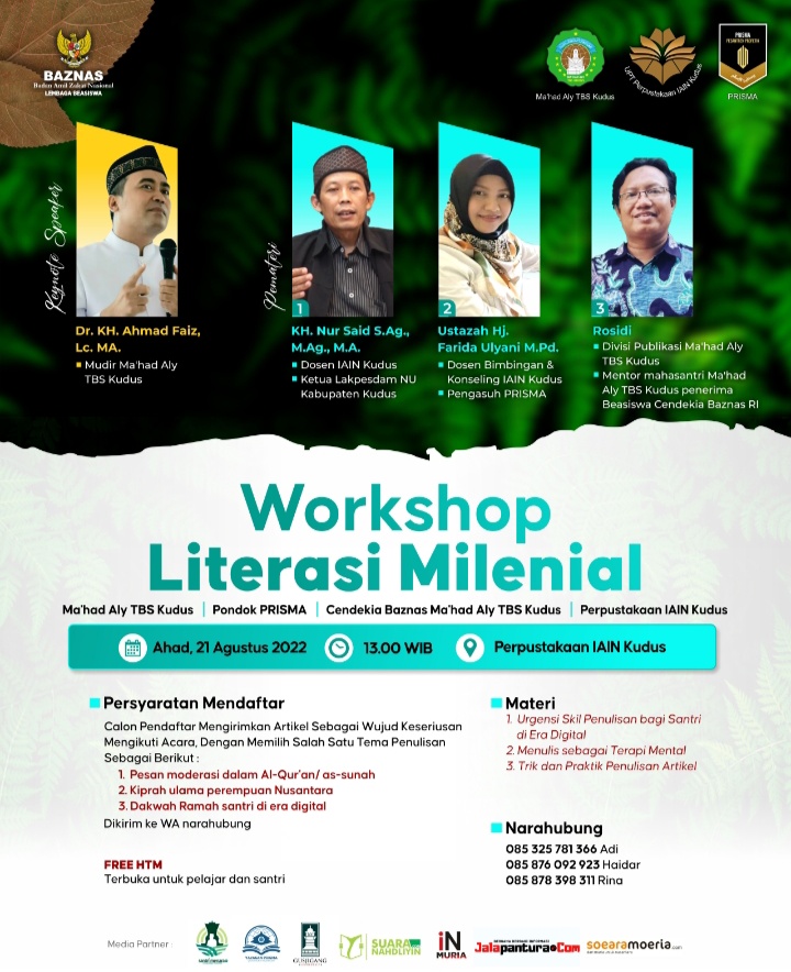 KUDUS, Suaranahdliyin.com – Ma’had Aly TBS Kudus bekerja sama dengan Perpustakaan IAIN Kudus, Pesantren Riset Sains-spiritual Moderasi Al-Qur’an (PRISMA) dan Cendekia Baznas Ma’had Aly TBS Kudus akan menyelenggarakan workshop literasi di Aula Perpustakaan IAIN Kudus pada Ahad (21/8/2022) mendatang.