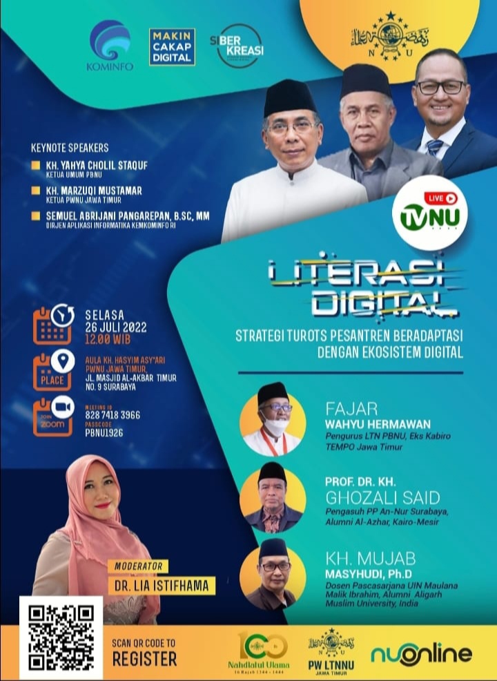 Bagaimana supaya turots pesantren mampu beradaptasi di tengah kepungan arus digital semacam facebook, twitter, tiktok, youtube dan sejenisnya, maka akan dilangsungkan seminar literasi yang sangat menarik pada Selasa (26/7/2022) di Aula KH Hasyim Asyari Lantai III Gedung PWNU Jawa Timur