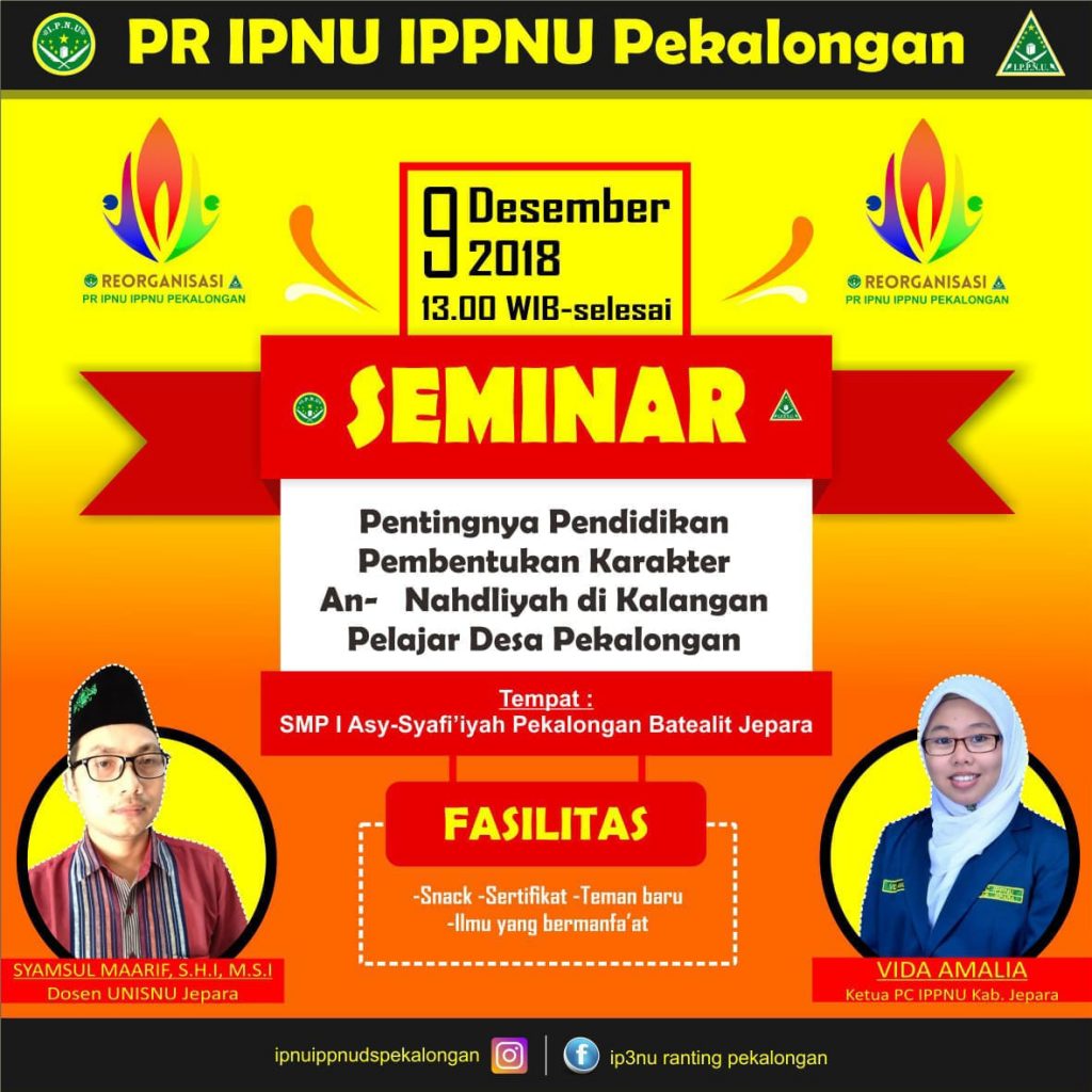 Seminar bertajuk ”Pentingnya Pendidikan Pembentukan Karakter An-Nahdliyah di Kalangan Pelajar Desa Pekalongan” ini digelar di SMP I Asy-Syafi’iyah Pekalongan mulai pukul 13.00 Wib.