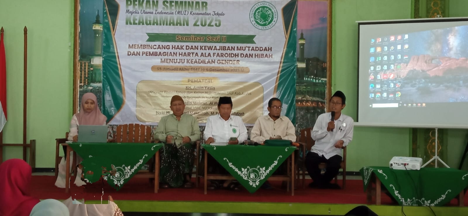 KUDUS,Suaranahdliyin.com – Majelis Ulama Indonesia (MUI) kecamatan Jekulo Kabupaten Kudus kembali melanjutkan kegiatan pekan Seminar Keagamaan 2025. Pada seminar sesi kedua Sabtu (6/12/2025) di Gedung IPHI-JHK Kec. Jekulo menghadirkan tiga narasumber yang membahas isu penting tentang keadilan perempuan dalam syariat Islam, terutama melalui kajian iddah, faraidh, dan hibah.