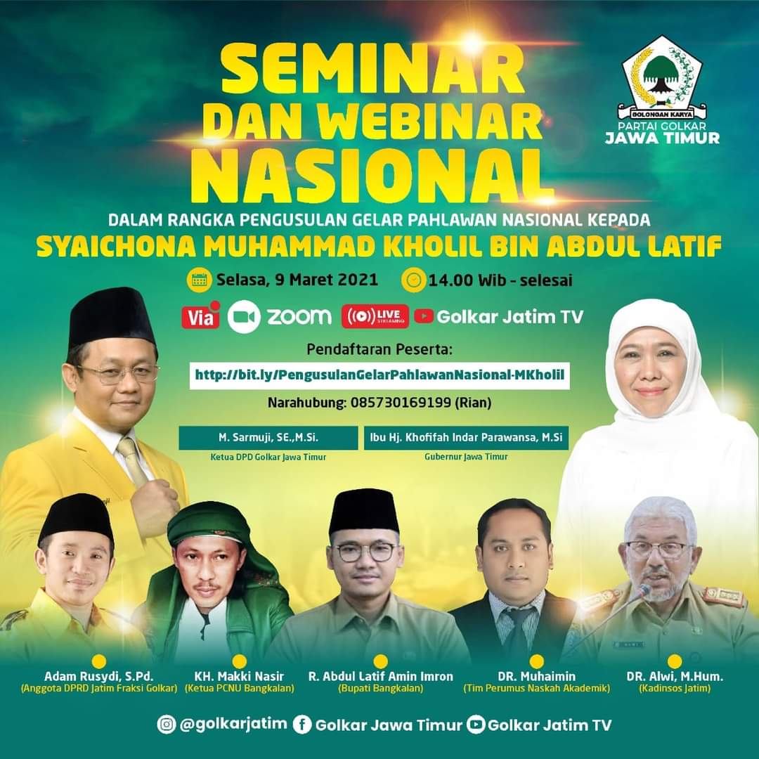BANGKALAN, Suaranahdliyin.com – Digelar live melalui zoom, Selasa (9/3/2021) siang ini mulai pukul 14.00 WIB, akan dilangsungkan webinar nasional terkait pengusulan Syaikhona M Kholil Bangkalan (Mbah Kholil) sebagai pahlawan nasional bersama Hj Khofifah Indar Parawansa MSi (Gubernur Jawa Timur) dan M Sarmuji SE MSi (ketua DPD Golkar Jawa Timur).