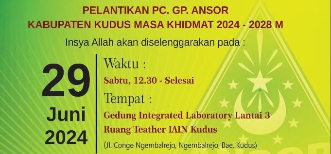 KUDUS, Suaranahdliyin.com – Bertempat di Ruang Teater Lantai III Gedung Interated Laboratory IAIN Kudus, akan dilangsungkan pelantikan pengurus PC GP Ansor Kudus masa khidmat 2024 – 2028 M.