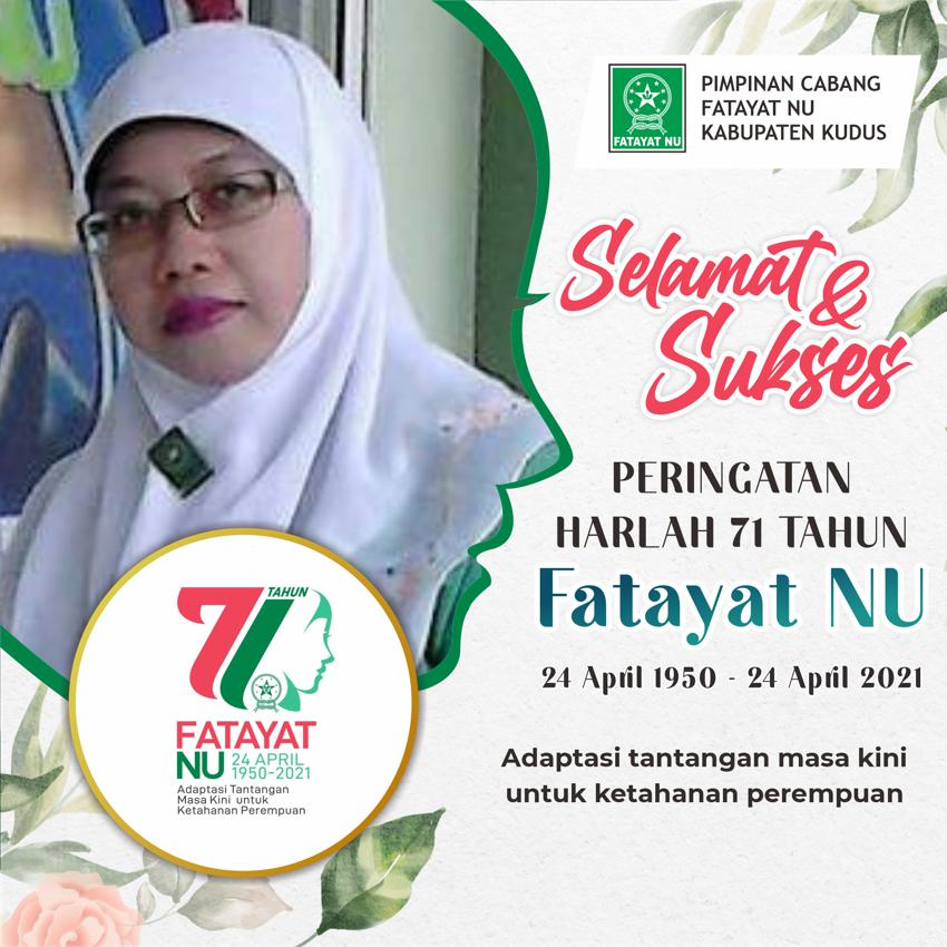 Yenni Astuti diamini Ketua PC Fatayat NU Kudus, Nik Hayati, mengutarakan, bahwa puncak Harlah ke-71 Fatayat NU di Kabupaten Kudus, akan diselenggarakan pada Sabtu (24/4/2021) mendatang di Lantai II Kantor PCNU Kabupaten Kudus.