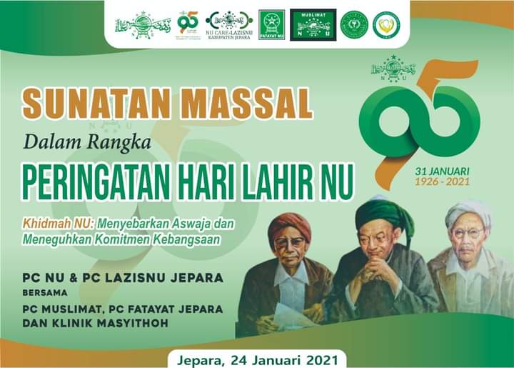 JEPARA, Suaranahdliyin.com – Dalam rangka memperingati Hari Lahir (Harlah) NU ke-95 PCNU dan LAZISNU Jepara bakal menggelar Sunatan Massal pada Ahad (24/1/2021). Sunatan Massal juga disupport PC Muslimat NU, PC Fatayat NU, dan Klinik Masyithoh.