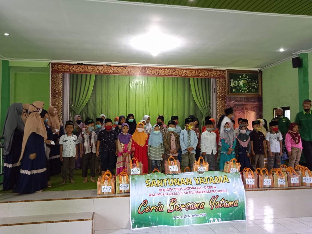 KUDUS<Suaranahdliyin.com – Unit Pengelola Zakat Infaq Shodaqoh Nahdlatul Ulama (UPZISNU) Kecamatan Dawe bersama perkumpulan wali siswa kelas 5 E SD NU Nawakartika mengadakan santunan kepada puluhan anak yatim di Gedung MWC NU Dawe, Jumat (25/12/20).