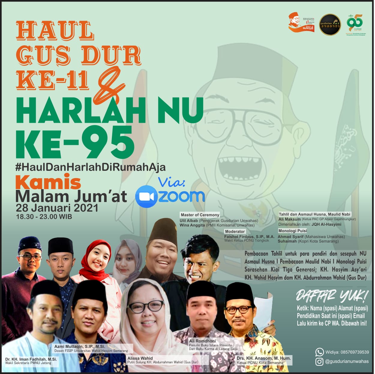 SEMARANG, Suaranahdliyin.com – Gusdurian Unwahas Semarang akan menyelenggarakan peringatan Hari Lahir ke-95 Nahdlatul Ulama (NU) yang dirangkai dengan haul ke-11 KH Abdurrahman Wahid (Gus Dur) pada Kamis (28/1/2021) makam melalui zoom pada pukul 18.30 – 23.00 WIB.