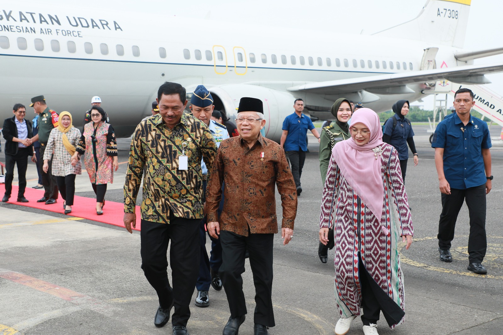 KH Ma’ruf Amin beserta rombongan tiba di Lanumad Ahmad Yani sekira pukul 16.00 WIB. Rombongan langsung disambut oleh Pj Gubernur Jawa Tengah, Kapolda Jateng, Pangdam IV/Diponegoro, Danlanumad Ahmad Yani, dan Danlanal Semarang.